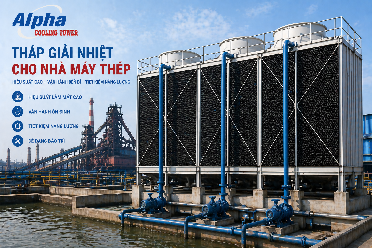 Tháp giải nhiệt (Cooling Tower) chính là giải pháp tối ưu giúp doanh nghiệp thép duy trì hệ thống làm mát ổn định, tiết kiệm năng lượng và nâng cao hiệu suất sản xuất.