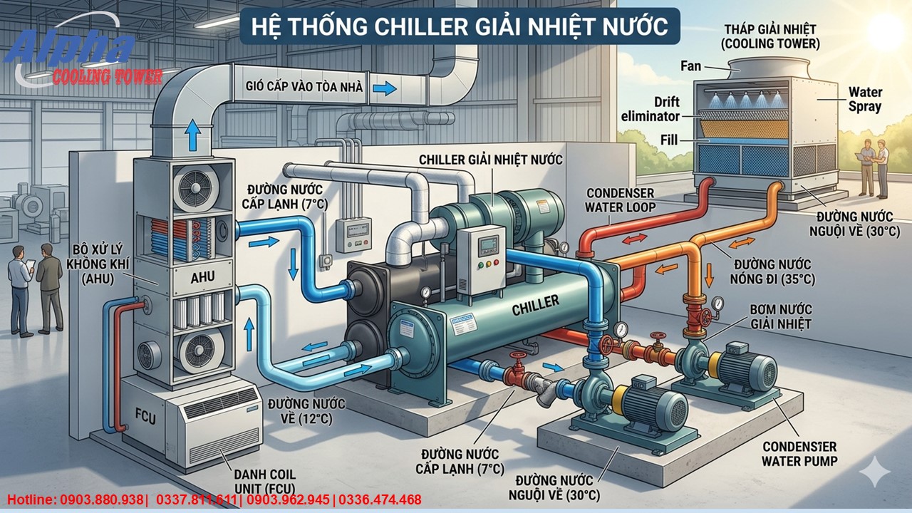 Hệ thống chiller giải nhiệt nước gồm những gì? Phân tích chi tiết cooling tower, bơm, AHU và nguyên lý hoạt động thực tế. Tư vấn chuẩn kỹ thuật.