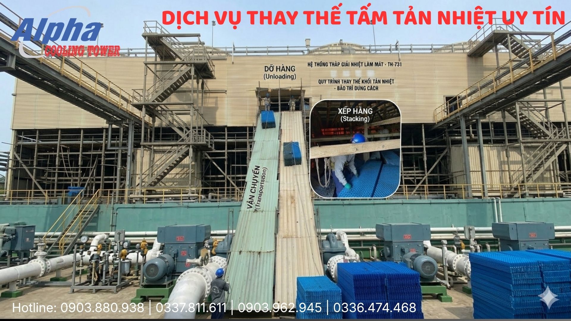 Dịch vụ thay thế tấm tản nhiệt tháp giải nhiệt uy tín, đúng kỹ thuật tại Công ty TNHH Tháp Giải Nhiệt Công Nghiệp Alpha Việt Nam. Thi công nhanh, tối ưu hiệu suất, bảo hành rõ ràng.